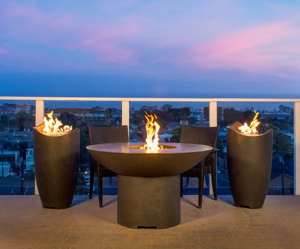 Say hello to American Fire Designs newest fire urn in the best way. Wave! The American Fire Designs Wave Urn is the modern design aesthetic your outdoor living space needs. Handcrafted from glass fiber reinforced concrete giving every American Fire Design urn a natural stone look and texture that complements almost any style. This Wave Fire Urn is fueled by your choice of natural gas or propane. You’ll also find a natural flame pattern thanks to the 12″ stainless steel star-shaped burner with a BTU output up to 60,000. This fire urn is made with a removable door to accommodate a 5 gallon propane tank. American Fire Design’s Wave Urn is available in four beautiful finishes: black lava, cafe blanco, sedona, and smoke.