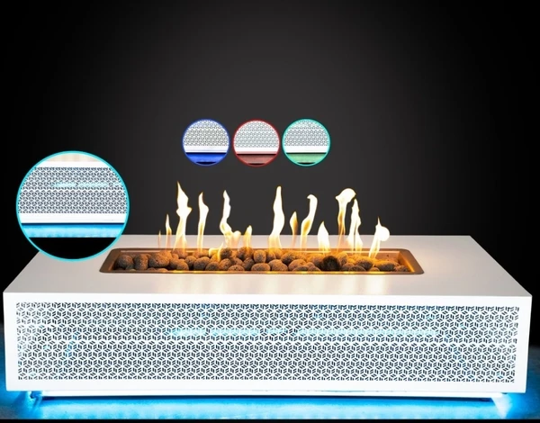 * Please Note: This item is custom made by the manufacturer and can not be cancelled or returned once the order is placed unless the item is defective or damaged in transit. *Also Note: Use only a breathable cover material with this fire feature. Do not use a plastic/non-breathable cover, this may result in the cover sticking to the fire feature. *Also Note: Slight variations in color and texture may occur. *Please Note: This item is custom made by the manufacturer and can not be cancelled or returned once the order is placed unless the item is defective or damaged in transit. The Outdoor Plus 72 Inch Manila LED Powder Coat Steel Gas Fire Pit boasts a modern design that makes it easier than ever before to enjoy dazzling flames from your own backyard. The fire pit features integrated LED lights that can be controlled from your mobile phone, allowing you to turn them on or even change their color without leaving your seat. Built with galvanized steel and finished with a rust-resistant powder coating, the Manila fire pit operates well even after years of use outdoors.