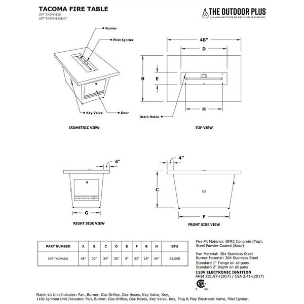 * Please Note: This item is custom made by the manufacturer and can not be cancelled or returned once the order is placed unless the item is defective or damaged in transit. *Also Note: Use only a breathable cover material with this fire feature. Do not use a plastic/non-breathable cover, this may result in the cover sticking to the fire feature. *Also Note: Slight variations in color and texture may occur. *Please Note: This item is custom made by the manufacturer and can not be cancelled or returned once the order is placed unless the item is defective or damaged in transit. The Outdoor Plus Tacoma 48 x 30 Inch Gas Fire Pit Table with Oak Top is handmade and proudly manufactured in the United States. This peerless craftsmanship, combined with the durable concrete construction, allows this fire pit to endure rough outdoor conditions while still performing all year long. The fire pit offers you the choice of a convenient electronic ignition or match-lit ignition. The Tacoma fire pit table is also compatible with a range of wall switches and remotes. You also have your choice of multiple unique color combinations to choose from.